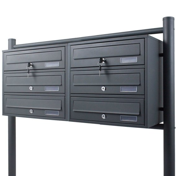 Dzięki zwartej konstrukcji i pełnemu zestawowi montażowemu (w tym stojakom i belkom poprzecznym), zestaw pozwala na stabilne mocowanie w betonie, oszczędzając jednocześnie miejsce. Każda skrzynka posiada osobny zamek oraz okienko na nazwisko.