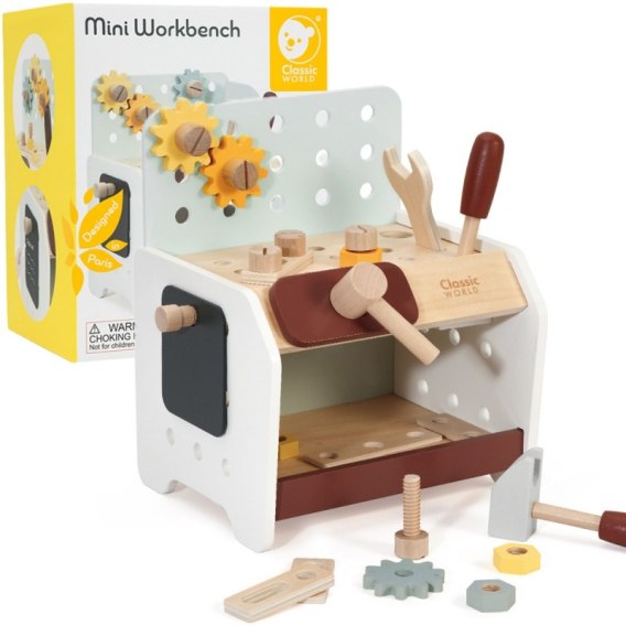 Drewniany stół warsztatowy od markiClassic World zapewni wspaniałą zabawę każdemu małemu majsterkowiczowi. Dzięki wielu narzędziom w zestawie, zabawa w majsterkowanie wspomoże rozwój zdolności manualnych, zaciekawi i rozpali dziecięcą wyobraźnię. Od teraz każdy maluch będzie miał okazje doskonalić swoją kreatywność gdyż zestaw zawiera wszystko co mu potrzebne do reperowania, wkręcania, wbijania gwoździ i wszelkich innych prac remontowych. Zestaw został wykonany z wysokiej jakości drewna, nie zawiera ostrych krawędzi, dzięki czemu jest bezpieczny dla dzieci i środowiska.