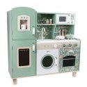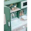 Przepiękna Kuchnia od marki CLASSIC WORLD to świetna propozycja dla dzieci które lubią wcielać w różne role osób dorosłych podpatrzonych w życiu codziennym.Ta drewniana kuchnia do zabawy jest w przeważającej części zielona z pięknymi kwiatowymi wzorami, dzięki czemu dzieci mogą cieszyć się klasycznym stylem retro. Zestaw zawiera wiele obszarów funkcjonalnych, takich jakzlew, kuchenka, szafki i zmywarka oraz wiele innych. Po lewej stronie znajduje się tablica, po której dzieci mogą pisać. Na kuchence natomiast można symulować gotowanie, zyskując niesamowite wrażenia kulinarne.