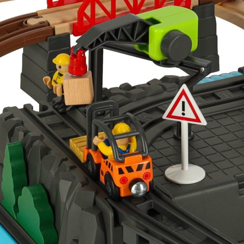 Na jednym pagórku znajduje się dźwig, który pomaga w  rozładowaniu lub załadowaniu ładunku z pociągu - scenariusz zabawy zależy od wyobraźni dziecka. Akcesoria takie jak znaki drogowe, pachołki, drzewka i figurki pozwalają na uzupełnienie scenerii wokół zbudowanego toru.