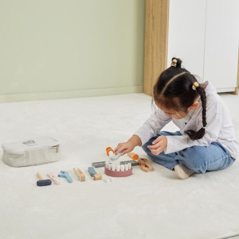 Drewniany Zestaw Dentysty z serii PolarB od marki Viga jest jedną z tych zabawek, które poprzez zabawę w odgrywanie ról sprawią, że dziecko pozbędzie się strachu i nabędzie pewności siebie w stresujących sytuacjach, które mogą go czekać w przyszłości. Wizyty u dentysty mogą być prostsze i bardziej przyjemne, gdy minie lęk przed sprzętem dentystycznym. W zestawie znajdziemy poręczną torbę, a w niej zestaw zabawek drewnianych, w tym: zestaw zębów (w tym dwóch dodatkowych), wiertło, szczypce do wyrywania zębów, szczoteczkę, nić dentystyczną, pęsetę, zdjęcia rentgenowskie, lustereczko, młoteczek i tubkę pasty.