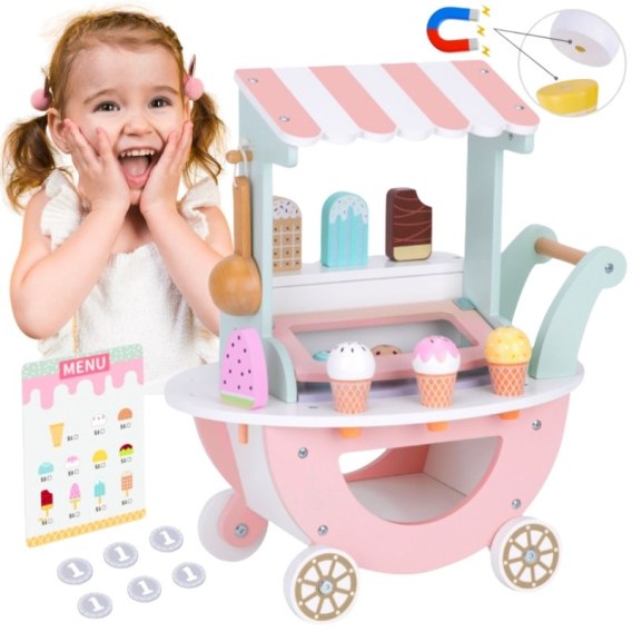 - - Bogaty zestaw akcesoriów: Zawiera lody na patyku, wafelki, kolorowe gałki, łyżkę do lodów, menu oraz drewniane monety - łącznie 27 elementów