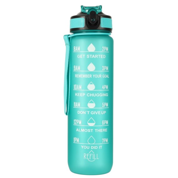 Butelka na wodę o pojemność 1 litra to idealny sposób, by pozostać nawodnionym przez cały dzień! Dzięki niej unikniesz konieczności kupowania jednorazowych butelek z wodą. Bidon wyposażony jest w praktyczny ustnik ze słomką, co sprawia, że picie z niego jest niezwykle wygodne i nie wymaga przechylania. Dodatkowo klips zabezpieczający chroni wieczko butelki przed przypadkowym otwarciem się. Miarka z godzinami i motywacyjnymi hasłami zachęca do regularnego picia wody. Wykonana została z wytrzymałego i bezpiecznego dla kontaktu z żywnością tritanu, niezawierającego BPA.