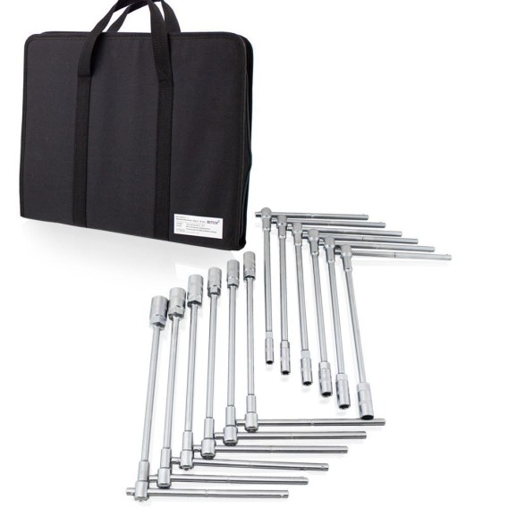 12-częściowy zestaw kluczy nasadowych sześciokątnych z wytrzymałej i odpornej stali chromowo-wanadowej. Każdy klucz ma poręczny uchwyt T z regulacją. Praktycznie i przejrzyście ułożone w torbie transportowej dołączonej do zestawu.