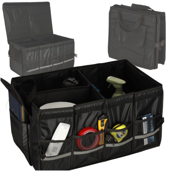 Przenośna torba do auta z przegródkami mocowanymi na rzepy pozwoli Ci wygodnie przewozić rzeczy o różnych gabarytach. Wyróżnia ją odblaskowa taśma z boku, która zdecydowanie ułatwia rozpakowywanie bagażu po zmierzchu.