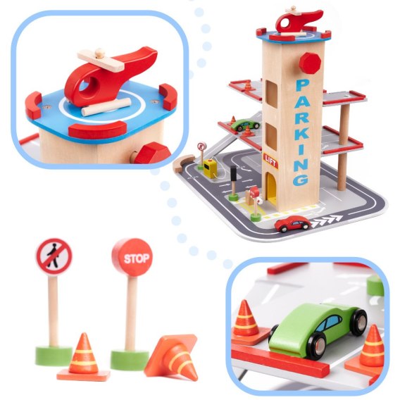 Przepiękny drewniany garaż miejski ma aż cztery poziomy! Pierwsze trzy przeznaczone są dla aut - znajdzie się tam miejsce dla drewnianych samochodzików dołączonych do zestawu, a także wielu innych pojazdów Twojego dziecka. Na kolejne piętra dostaną się one przy pomocy windy!
