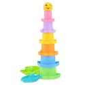 Piramidka w kolorach tęczy od marki WOOPIE jest zabawką, która doskonale wpływa na rozwój maluszka. Składa się z kubeczków w różnych kolorach. Na szczycie zabawki znajduje się piłeczka z nadrukiem wesołej buźki. Kubeczki wykonane są z bezpiecznego, nietoksycznego materiału, który odznacza się solidnością i wytrzymałością. Piramidka ma bardzo opływowy, zaokrąglony kształt, co wpływa na poziom bezpieczeństwa płynący z korzystania z przedmiotu.