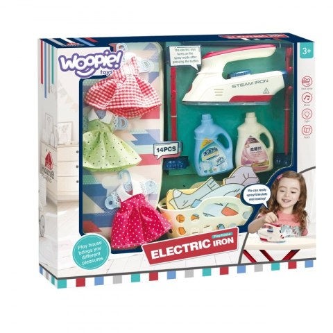 Zestaw do Prasowania od marki WOOPIE dostarczy dziecku mnóstwo zabawy w małą gospodynię domową. W zestawie znajdziemy żelazko, deskę do prasowania, kosz na pranie, stojący wieszak, trzy małe sukienki dla lalek oraz dwa opakowania płynu do prania. Żelazko jest zabawką bezpieczną dla dzieci, ponieważ nie nagrzewa się. Zostało ono wyposażona wwiele funkcji, które urozmaicą zabawę: 1 z przycisków znajdujący się na rączce żelazka który po wciśnięciu i trzymaniu odwzorowuje prawdziwe dźwięki prasowania, świecącą lampkę LED oraz efekty dźwiękowe w postaci piosenek. Jest to doskonały zestaw dla dzieci, które uwielbiają naśladować rodziców podczas codziennych czynności.