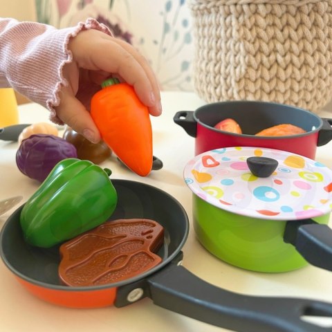 Duży zestaw kucharza marki Woopie to gratka dla każdego małego kucharza. Każdy maluch naśladuje rodziców, a zestaw Woopie pozwoli na posiadanie swoich naczyń i przygotowanie własnych dań. Wszystkie przedmioty zrobione z dbałością o każdy szczegół. Mamy tam garnek i rondelek, które mają swoją pokrywkę, dodatkowo patelnie, miseczkę, artykuły spożywcze oraz przybory kuchenne. Zestaw przeznaczony dla dzieci od 3 roku życia.