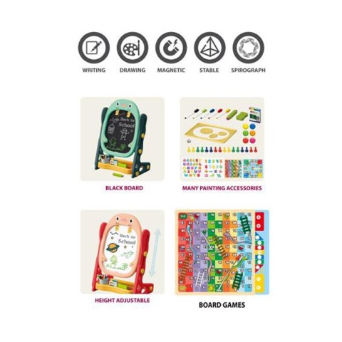 Dwustronna Tablica Magnetyczna do Rysowania od marki WOOPIE to wszechstronne narzędzie do nauki i pogłębiania zdolności artystycznych. Zestaw zawiera pełen pakiet akcesoriów do wszechstronnego użytkowania. Tablica jest prosta w montażu i dodatkowo posiada regulacje wysokości, dzięki czemu można ja dopasować do każdego dziecka. Zabawka jest niezbędna do codziennego rozwoju dziecka.